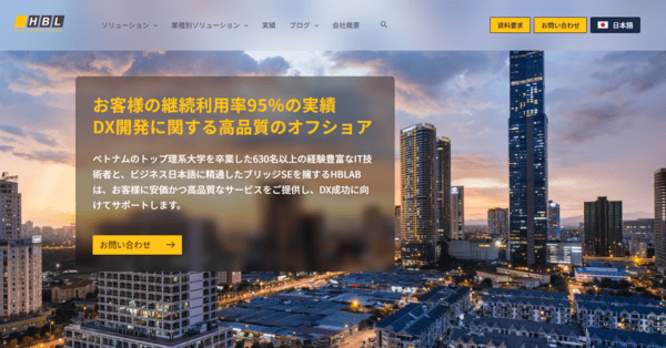 エイチビーラボジャパンは、ベトナムのトップ技術者によるオフショア開発サービスを提供しています。日本語対応のブリッジSEを通じた円滑なコミュニケーションが可能で、継続利用率95%以上(2024年10月調査時点)という信頼性の高いサービスを提供しています。